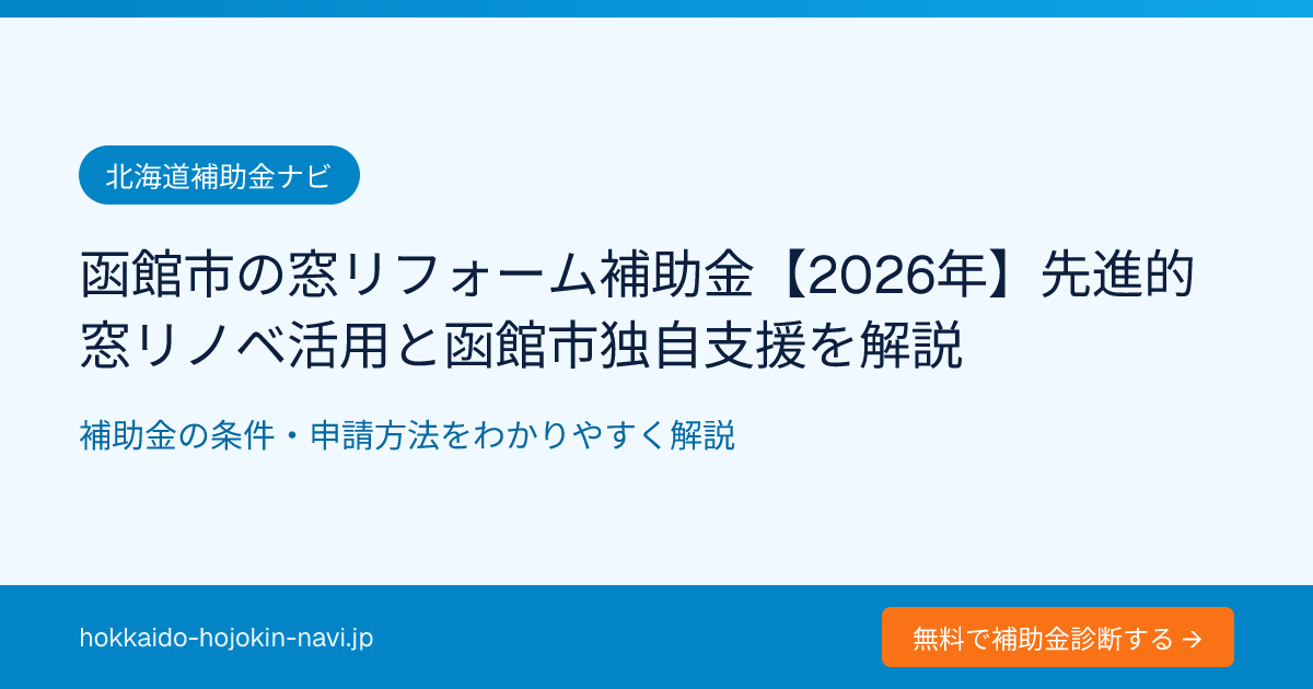 2026年現在、函館市の住民は国の「先進的窓リノベ2025事業」(2026年度も継続)と函館市独自の補助制度を組み合わせることで、窓工事費の最大半額以上を補助でカバーできるケースがあります。本記事では両制度の詳細、試算シミュレーション、申請手順、よくある疑問をまとめて解説します。