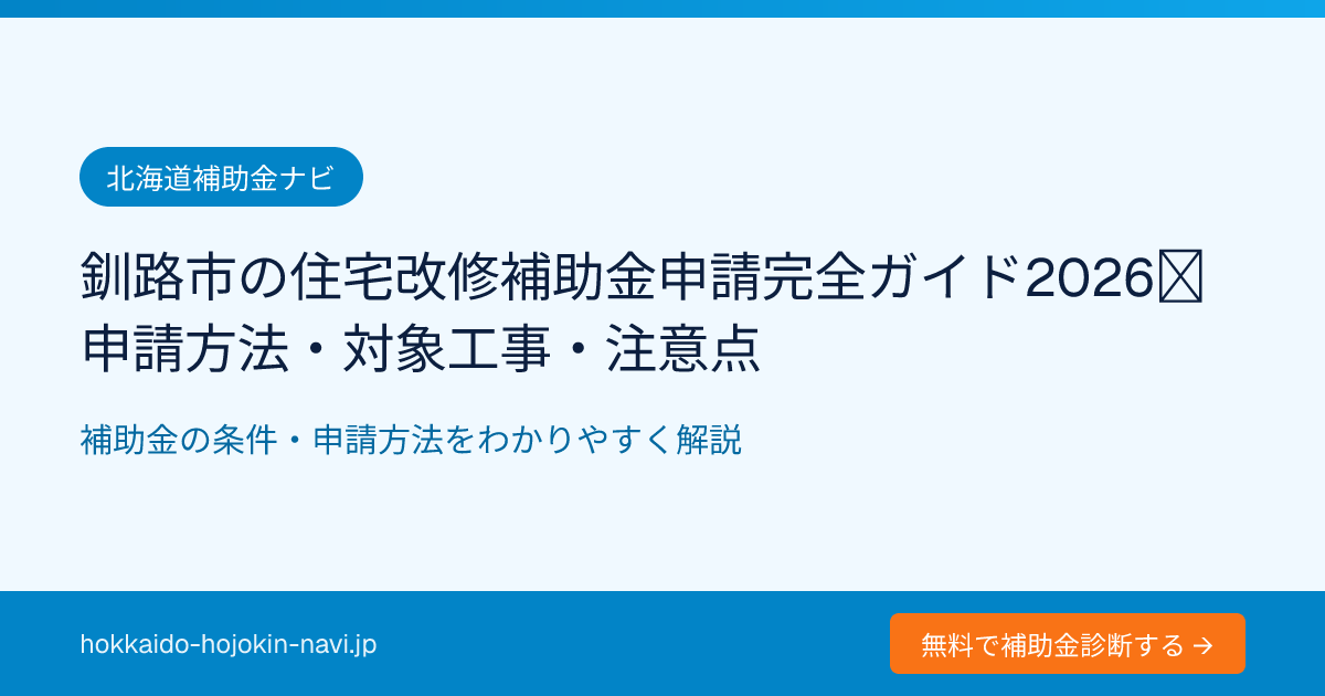 免責事項 本記事は2026年4月時点の情報をもとに作成しています。補助金制度の詳細(補助額・要件・申請期限等)は予告なく変更される場合があります。実際の申請にあたっては、必ず釧路市建築住宅課(0154-31-4560)または各補助制度の公式窓口にてご確認ください。本記事の内容に基づいて生じた損害・不利益について、当サイトは一切の責任を負いません。