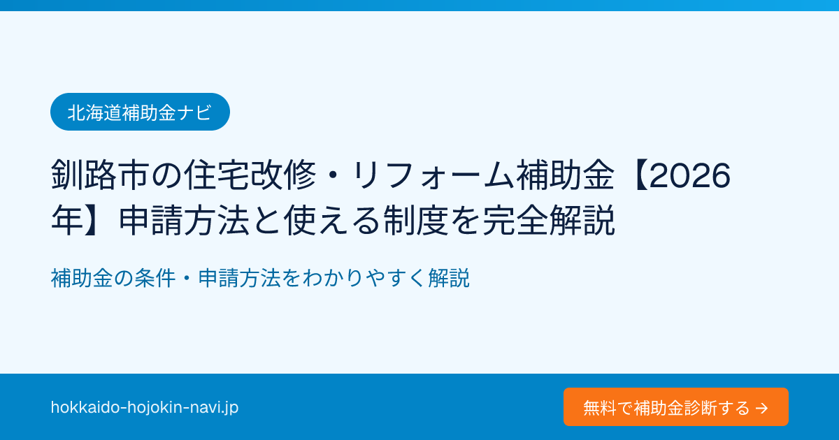 本記事では、2026年現在に釧路市で活用できる住宅改修・リフォーム補助金を網羅的に解説します。釧路市独自の補助制度から国の省エネ補助、介護保険の住宅改修費まで、条件・金額・申請手順をわかりやすくまとめました。初めて補助金申請に挑む方でも、この記事を読めば全体像を把握できるよう構成しています。