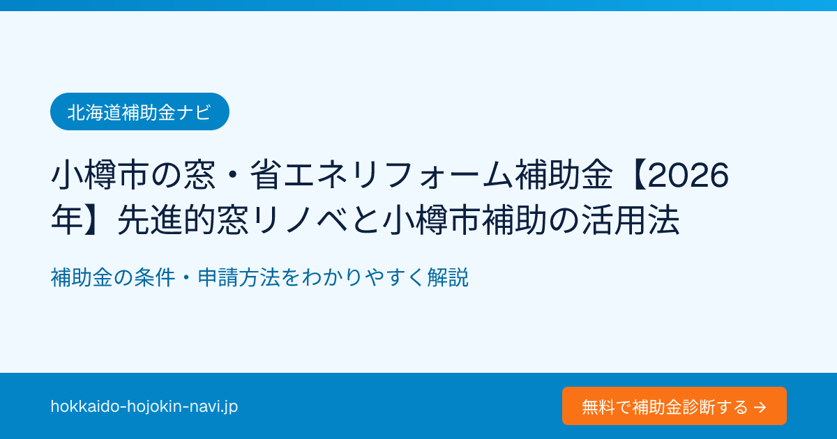 本記事の補助金情報は2026年4月時点の内容を基に作成しています。制度の詳細・最新情報は各制度の公式窓口にて必ずご確認ください。 先進的窓リノベ事業:環境省・経済産業省公式サイト参照 小樽市住宅リフォーム支援事業:小樽市建設部住宅課(電話:0134-32-4111)