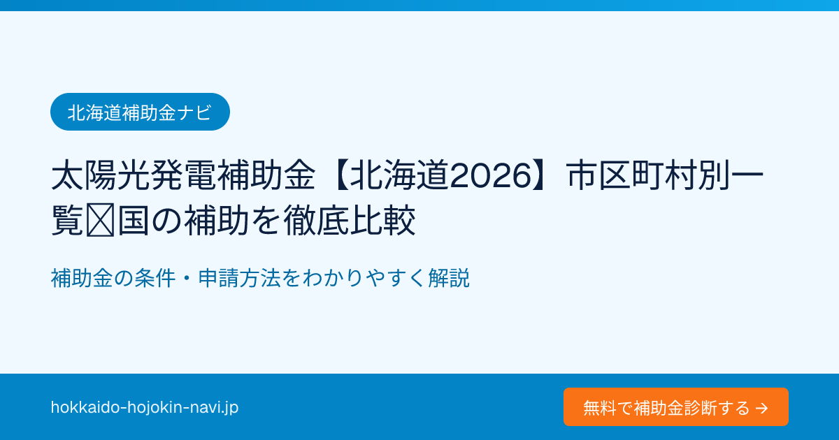 太陽光発電補助金【北海道2026】市区町村別一覧+国の補助を徹底比較