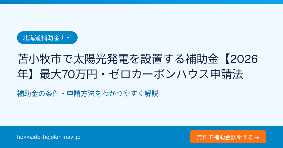 | 苫小牧市ゼロカーボンハウス促進補助金(太陽光発電) | 700,000円 | 1kWあたり10万円(上限70万円) | 要確認 | 公式ページ |